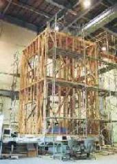 振動台上に設置した3.6×3.6mの総二階建て木造軸組構造物を加振し、その振動特性を把握した